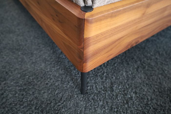 Bett, Liegefläche: 180 x 200 cm, Nussbaum massiv, geölt und gewachst, mit Splint, inkl. Nackenrolle Bezug Werther U3106H Graubraun, statt 5.084,- Ausstellungsstück zum Sonderpreis reduziert auf 3.690,-