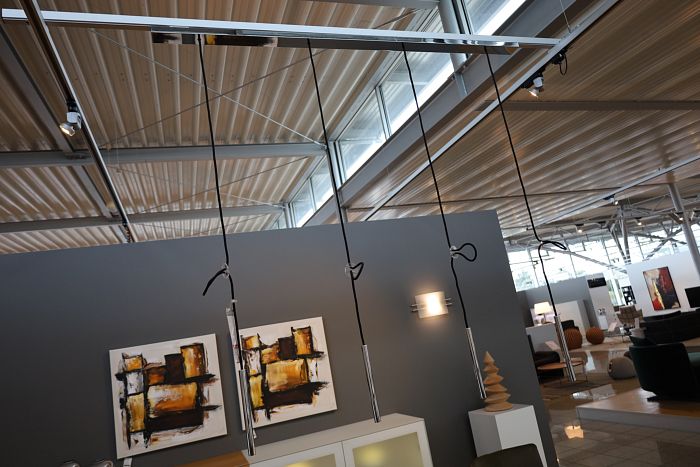 Pendelleuchte mit 4 Pendel, Baldachin Länge 158 cm, Alu poliert, verchromt, Textilkabel schwarz, LED warmweiß, statt 1.477,- Ausstellungsstück zum Sonderpreis reduziert auf 990.-