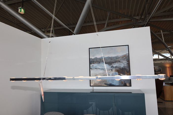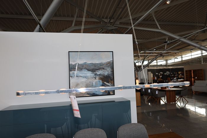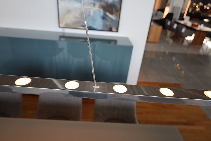 Hängeleuchte Maße: L: 130 cm, Baldachin Ø16,5 cm, Alu poliert, Leistung: LED 15 W 950lm 2700K, statt 1.490,- Ausstellungsstück zum Sonderpreis reduziert auf 1.149,-