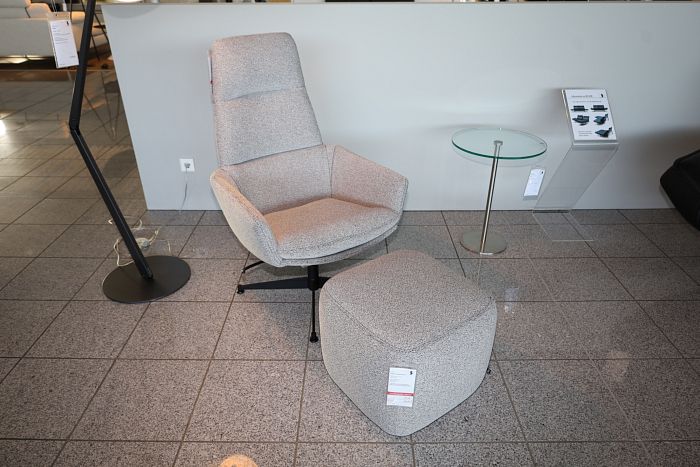 Sessel mit Hocker, Korpus Leder 282 basalt, Sitz und Rücken Stoff 8074 platin, mit Kippmechanik, Gestell 4- Fußgestell Alu poliert mit Kunststoffgleiter, statt 7.542,-