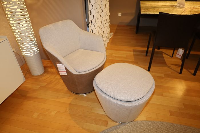 Sessel mit Hocker, Bezug Leder 491 beige-braun / Stoff 12027 Opera ecru-taupe, Drehteller mit Kunststoffgleiter, komplett statt 5.412,- Ausstellungsstück zum Sonderpreis reduziert auf 3.668,-