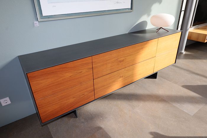 Sideboard, Maße: (BxHxT) 220 x 75 x 45 cm, Front Nussbaum geölt, Rahmen Natureisen transparent matt lackiert, mit zwei Türen und zwei Schubladen, statt 6.990,-