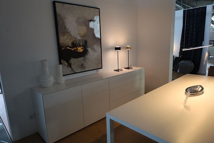 1 Sideboard, Lack matt weiss, mit 3 Schubkästen und 2 Drehtüren, Maße: (BxHxT) 241,3 x 77 x 48 cm, statt 3.286,- Ausstellungsstück zum Sonderpreis reduziert auf 2.490,-