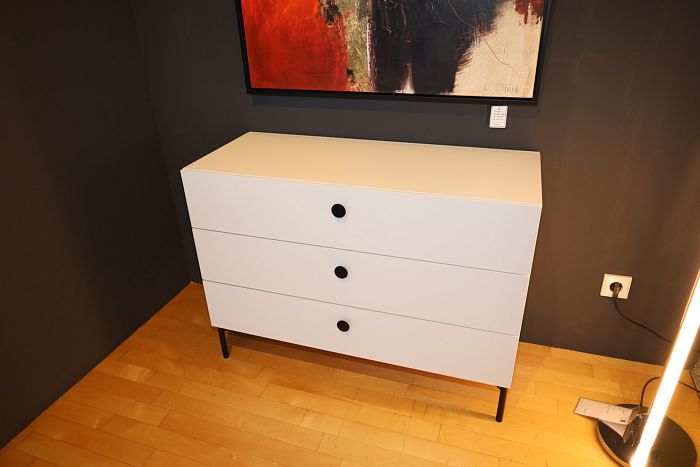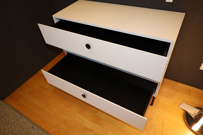 Schubkastenkommode, mit Raumteiler Rückwand, Melamin weiss, Füße und Griffknopf Lack schwarz, Maße (BxHxT): 100 x 73,6 x 39 cm, statt 2.256,- Ausstellungsstück zum Sonderpreis reduziert auf 1.579,-