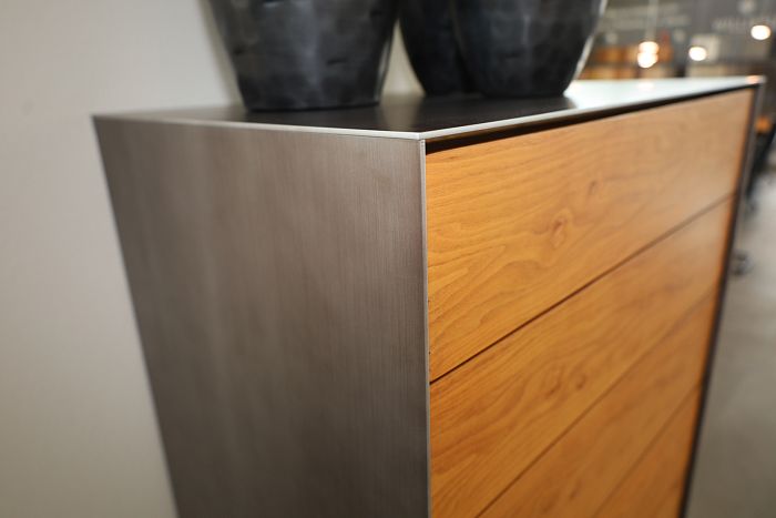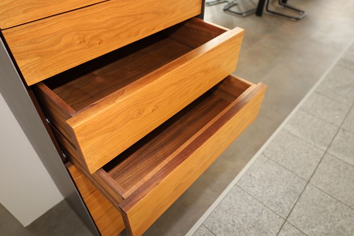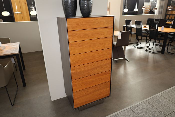 Kommode, Maße: (BxHxT) 64,8 x 138,5 x 46,3 cm, Nussbaum geölt, Rahmen Effekt Titan, mit 7 Schubladen, statt 7.125,- Ausstellungsstück zum Sonderpreis reduziert auf 4.990,-
