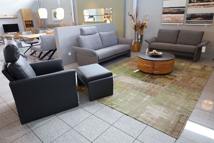 Polstergruppe, bestehend aus: 1x Sofa (BxHxT): 151 x 44/ 78-87 x 89-128 cm, 1x Sofa (BxHxT): 168 x 44/ 78-87 x 89-128 cm, 1x Sessel mit Hocker, Bezug Stoff Sofas Prairie Farbe 2022.89, Bezug Sessel Leder Farbe 43.059 Anthrazit, Armlehen verstellbar, komplett statt 13.007,- Ausstellungsstück zum Sonderpreis reduziert auf komplett 10.319,-