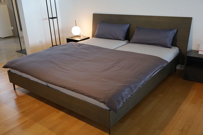 Bett mit Knickkopfteil, Maße: Kopfteilbreite: 205,6 cm, Liegefläche 180 x 200 cm, Eiche silbergrau, Füsse Lack graphit, statt 4.299,-