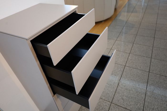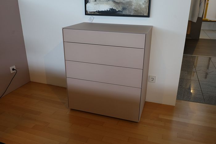 Schubkastenkommode, Maße (BxHxT) 80 x 93,2 x 48 cm, Lack matt puder, Glas matt puder, Schubkastenzargen Lack graphit, statt 3.972,-