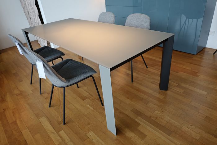 Esstisch, 220 ausziehbar auf 330 cm x 95 cm, Tischgestell lackiert Farbe schwarz, Tischbeinblenden & Tischplatten Glas matt asphalt, Längstraverse schwarz eloxiert, statt 7.255,-