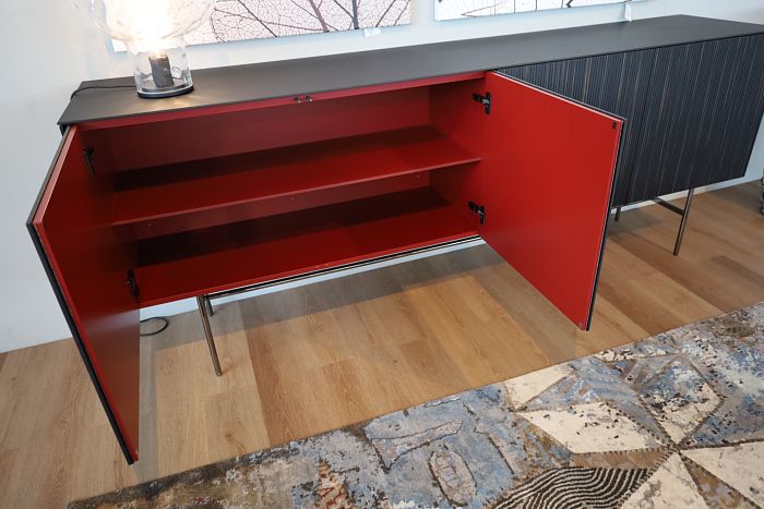 Sideboard, Raumteilerausführung, Maße (BxHxT) 241,6 x 94 x 50 cm, Lack matt rubin, Relief Marrone, Rundrohgestell schwarz-Chrom, statt 10.173,-