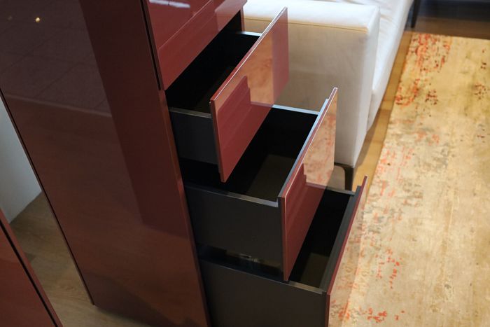 Schubladenkommode (BxHxT) 40 x 117,2 x 39 cm, Lack Beere Hochglanz, Zylindergriff Lack Beere matt, mit Raumteiler Rückwand, statt 3.203,-