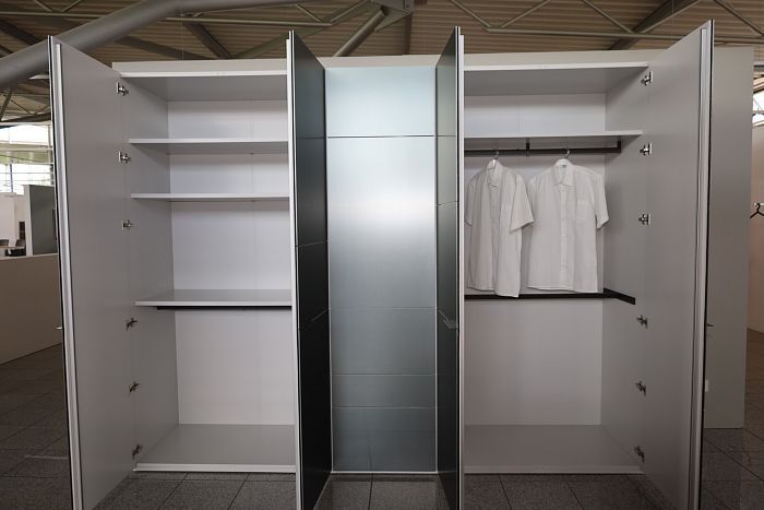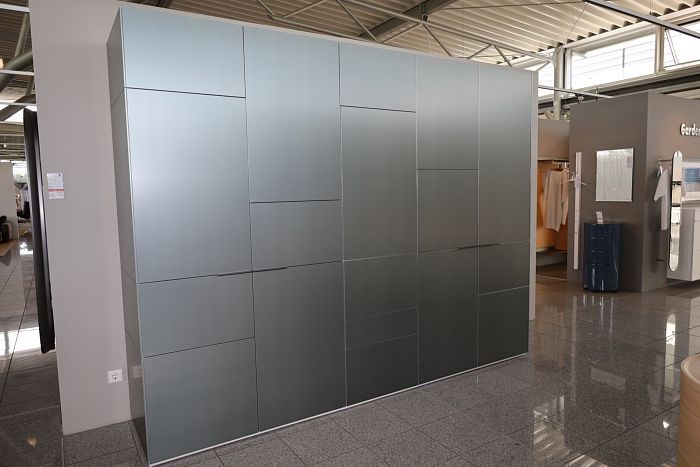 Kleiderschrank (BxHxT) 301,6 x 234 x 67 cm, Lack matt grauweiss, Frontblenden Alu Titan, Griffe Lack schwarz, inkl. Inneneinteilung statt 16.907,-