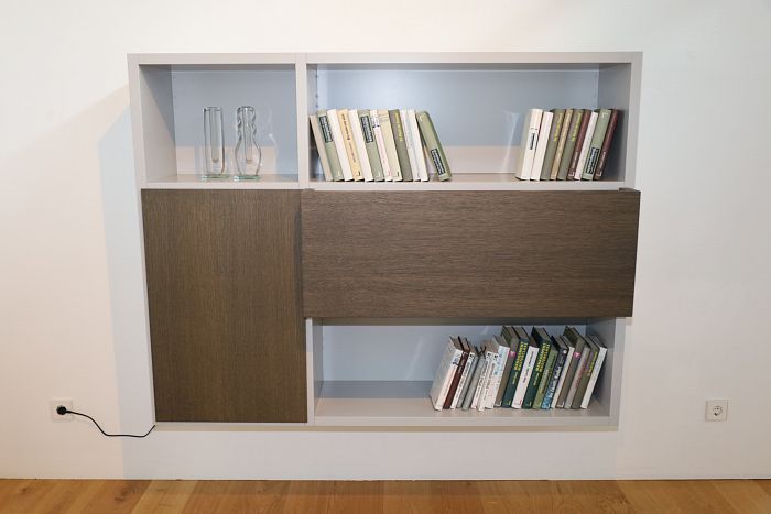 Türen-/Schubkastenschrank, Maße (BxHxT) 150 x 215,6 x 38 cm, Innen Lack matt graphit, Aussen Lack matt weiss / Lack hochglanz weiss, statt 9.670,-