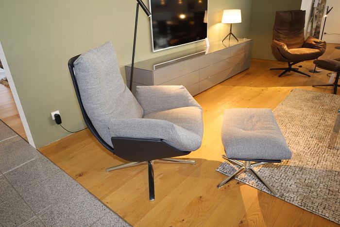 Sessel mit Hocker, Korpus Leder 282 basalt, Sitz und Rücken Stoff 8074 platin, mit Kippmechanik, Gestell 4- Fußgestell Alu poliert mit Kunststoffgleiter, statt 7.542,-