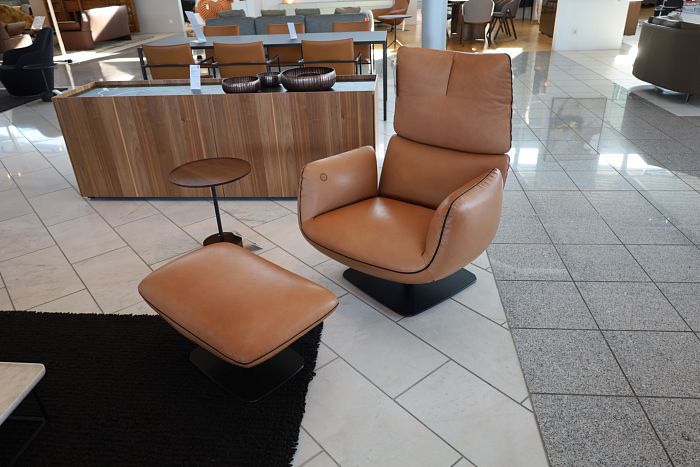 Sessel mit Hocker, drehbar, mit Kippmechanik, Auslösung links, Bezug Leder 922 cognac, Tellerfuß M20 Lack schwarz, komplett statt 7.897,-