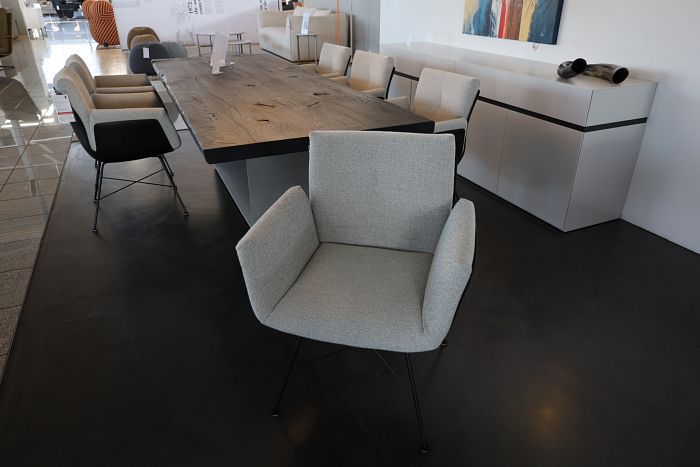 6 Armlehnstühle, mit 4-Fuß Drahtgestell P 120 schwarz mit Kunststoffgleiter, Schale K 20 Lack schwarz, Bezug Stoff 8071 salz/pfeffer, statt 7.998,-