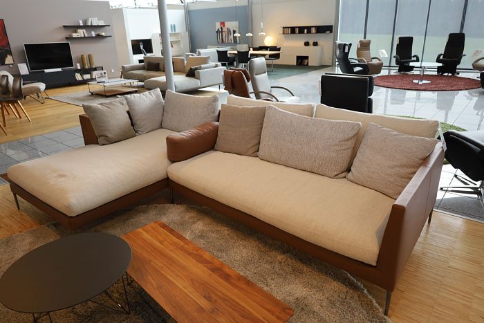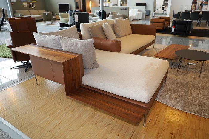 Polstergruppe (BxHxT): 321 (inkl. Ablage) x 66 x 115/180 cm, Leder 351 Kaffee, Stoff 5024 Sand, Ablagebrett 180 cm, Nussbaum massiv geölt, statt 16.682,-
