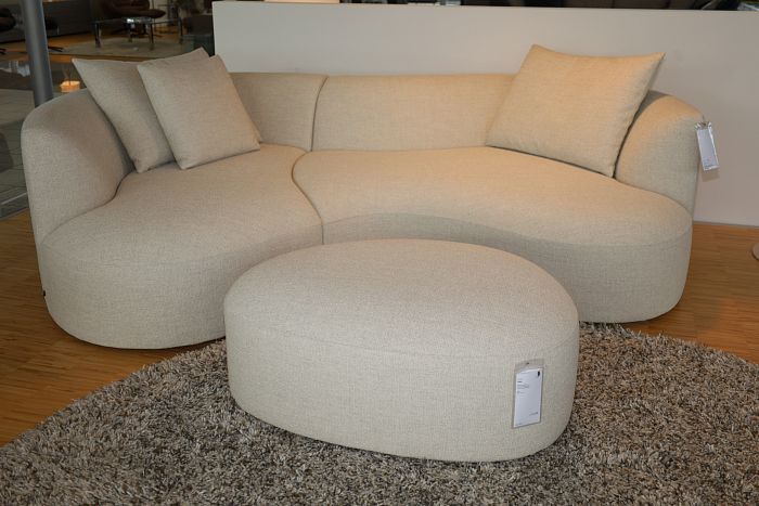 Polstergruppe (BxT): 287 x 225/85 cm , Stoff 8079 aschgrau, Schmalfüsse Edelstahl, Luftzellenstäbchenfüllung, inkl. 1 Kopfstütze mit Klappfunktion und 2 Kuschelkissen in Stoff 5026 nougat ecru, statt 14.160,-