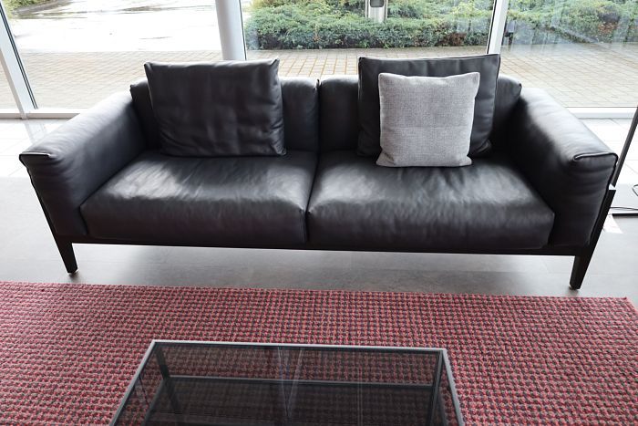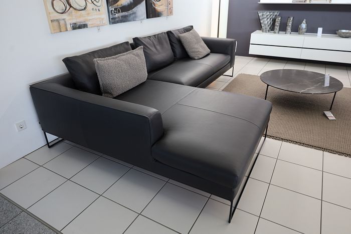 Polstergruppe (BxT): 310 x 190/95 cm, H: 66 cm, Leder 282 basalt, Fußrahmengestell P120 Pulver schwarz mit Kunststoffgleiter, Sitzkissenfüllung Visko, inkl. 3x Rückenkissen mit Rolle und 2 Kuschelkissen in Stoff 14002 hellgrau, statt 19.033,-