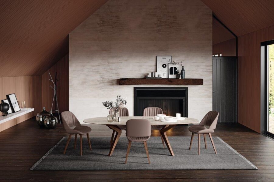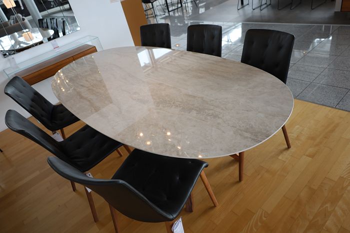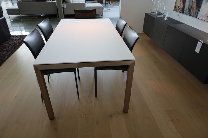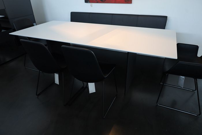 Die Form und Materialien der Tischplatte sind wählbar in Massivholz, Keramik, HPL, lackiert oder in Glas matt und glänzend.