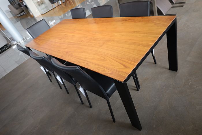 - Die Form und Materialien der Tischplatte sind wählbar in Massivholz, Keramik, HPL, lackiert oder in Glas matt und glänzend.