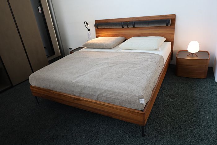 Bett, Liegefläche: 180 x 200 cm, Nussbaum massiv, geölt und gewachst, mit Splint, inkl. Nackenrolle Bezug Werther U3106H Graubraun, statt 5.084,-