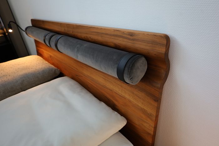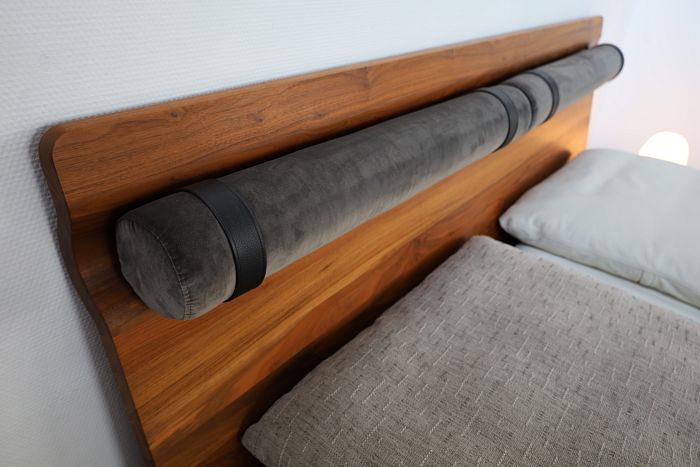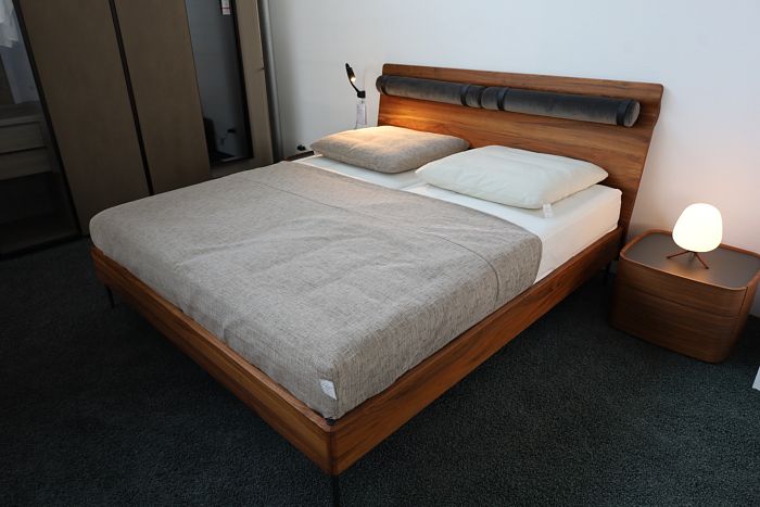 Bett, Liegefläche: 180 x 200 cm, Nussbaum massiv, geölt und gewachst, mit Splint, inkl. Nackenrolle Bezug Werther U3106H Graubraun, statt 5.084,- Ausstellungsstück zum Sonderpreis reduziert auf 3.690,-
