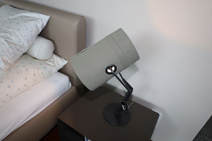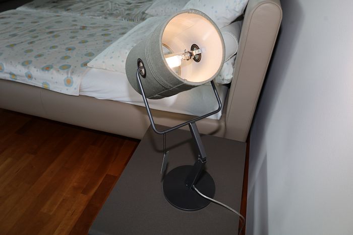 Tischleuchte, Stoff Grau, Gestell anthrazit, Maße: Ø 18/38 cm / H: 50/63 cm, Fassung: 1xR7s, mit Dimmer, statt 821,- Ausstellungsstück zum Sonderpreis reduziert auf 590,-