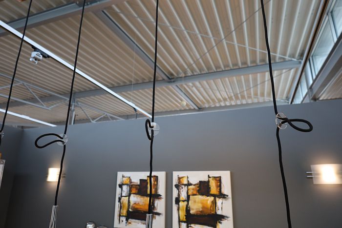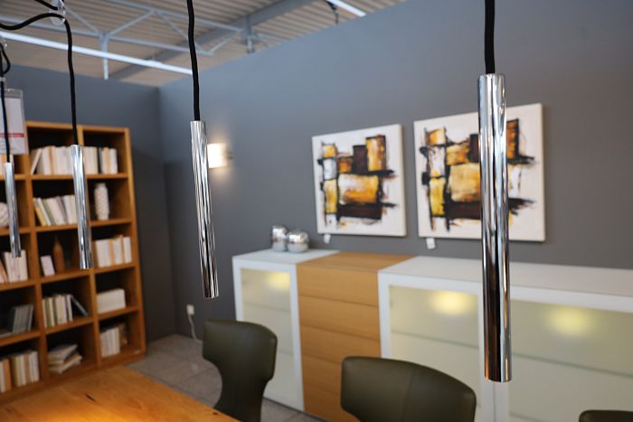 Pendelleuchte mit 4 Pendel, Baldachin Länge 158 cm, Alu poliert, verchromt, Textilkabel schwarz, LED warmweiß, statt 1.477,- Ausstellungsstück zum Sonderpreis reduziert auf 990.-