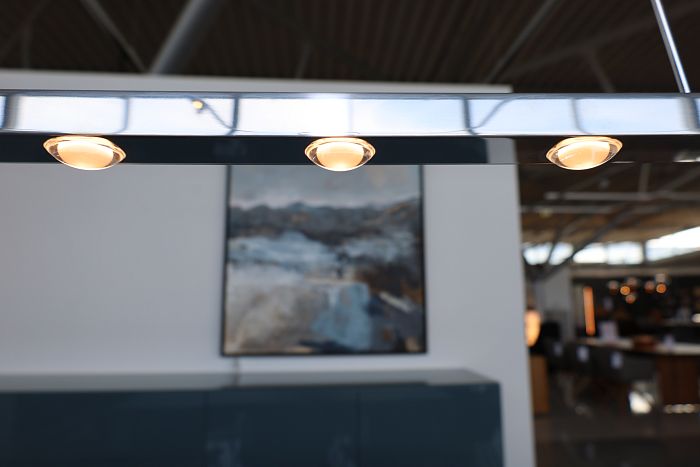 Hängeleuchte Maße: L: 130 cm, Baldachin Ø16,5 cm, Alu poliert, Leistung: LED 15 W 950lm 2700K, statt 1.490,- Ausstellungsstück zum Sonderpreis reduziert auf 1.149,-