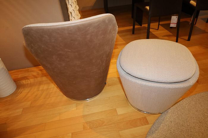 Sessel mit Hocker, Bezug Leder 491 beige-braun / Stoff 12027 Opera ecru-taupe, Drehteller mit Kunststoffgleiter, komplett statt 5.412,- Ausstellungsstück zum Sonderpreis reduziert auf 3.668,-