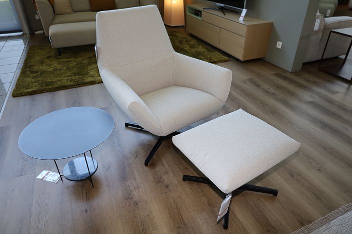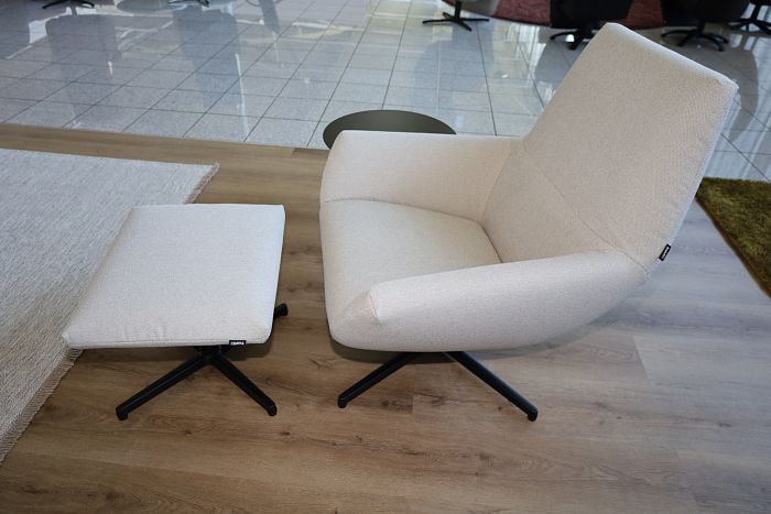 Sessel und Hocker, drehbar mit Wippfunktion und Höhenverstellung, Bezug Stoff hell steingrau 4046, Kreuzfuß Alu gepulvert schwarz, komplett statt 2.714,- Ausstellungsstück zum Sonderpreis reduziert auf komplett 1.939,-