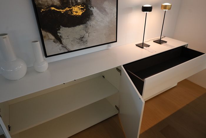 1 Sideboard, Lack matt weiss, mit 3 Schubkästen und 2 Drehtüren, Maße: (BxHxT) 241,3 x 77 x 48 cm, statt 3.286,- Ausstellungsstück zum Sonderpreis reduziert auf 2.490,-