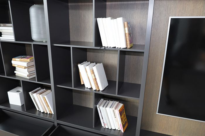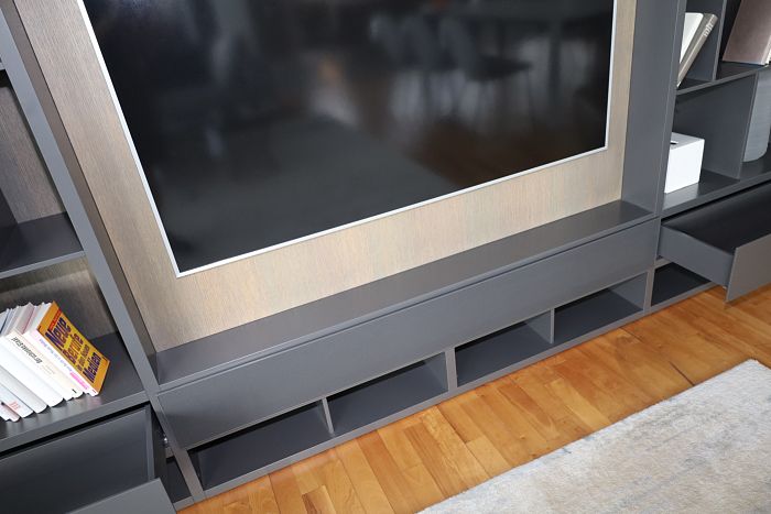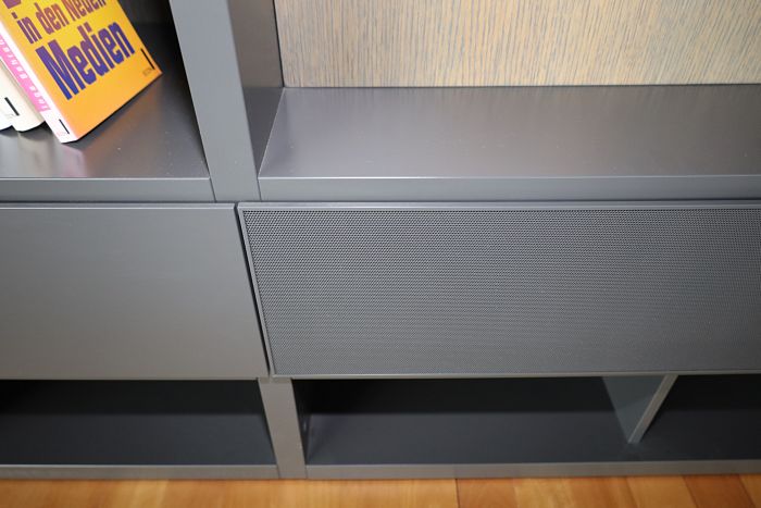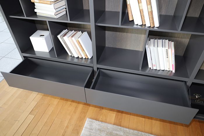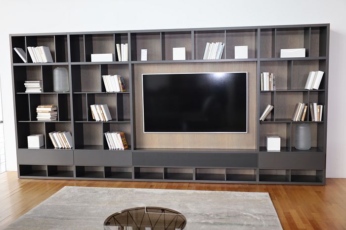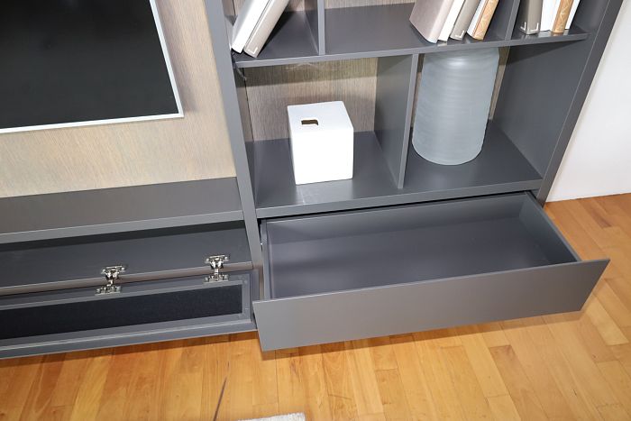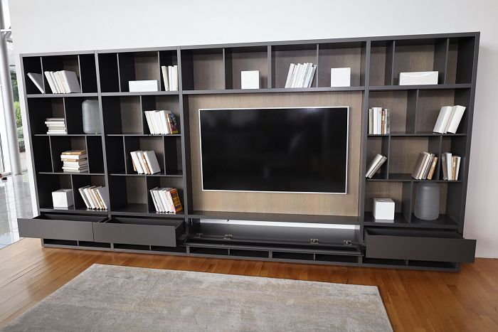 Wohnkombination (BxHxT) 403,2 x 195,7 x 35 cm cm, Struktur: Lack matt graphit, Rückwand/Paneel: Eiche silbergrau furniert, mit Akustik Klappe, statt 14.423,- Ausstellungsstück zum Sonderpreis reduziert auf 9.999,-