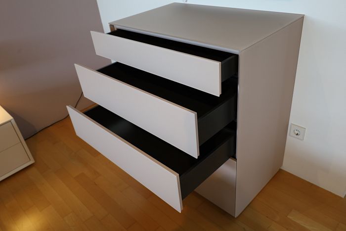 Schubkastenkommode, Maße (BxHxT) 80 x 93,2 x 48 cm, Lack matt puder, Glas matt puder, Schubkastenzargen Lack graphit, statt 3.972,-