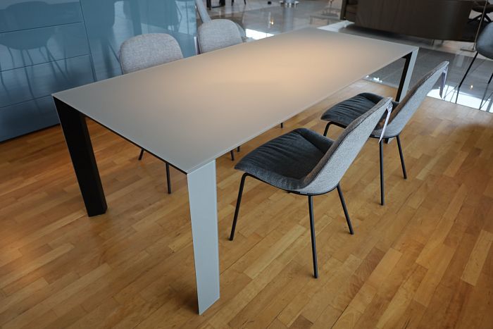 Esstisch, 220 ausziehbar auf 330 cm x 95 cm, Tischgestell lackiert Farbe schwarz, Tischbeinblenden & Tischplatten Glas matt asphalt, Längstraverse schwarz eloxiert, statt 7.255,-