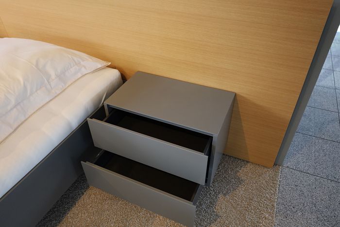 1x Nachttisch Maße (BxHxT) 40 x 38,4 x 35 cm, Lack matt graphit, 1 Schub unten & 1x Nachttisch Maße (BxHxT) 60 x 38,4 x 35 cm, Lack matt graphit, 1 Schub unten, komplett statt 1.621,-