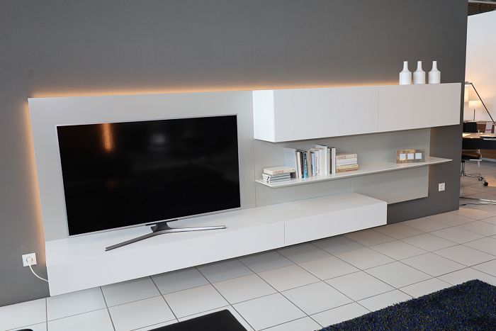Wohnwand (BxHxT) 360 x 115 x 36/48 cm cm, Lack weiß matt, Lack steingrau matt, mit Hinterkantenbeleuchtung, statt 9.893,-