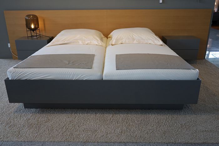 Bettanlage, Maße: Gesamtbreite: 400 cm / Höhe: 100 cm, Liegefläche 200 x 200 cm, Eiche matt furniert, Lack matt asphalt, statt 8.597.-