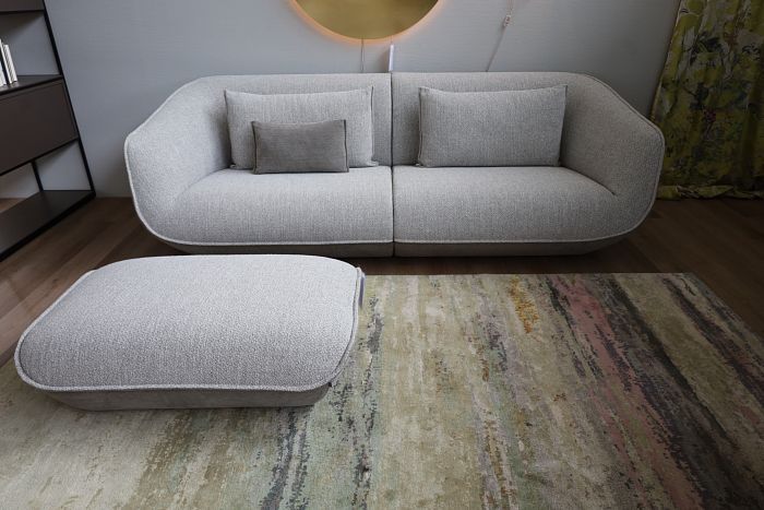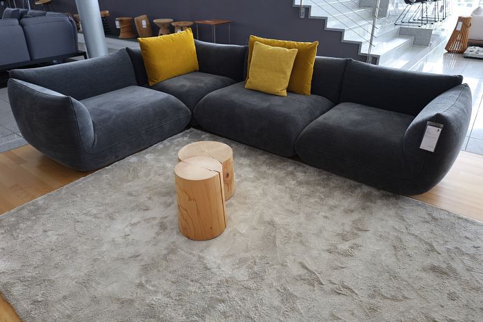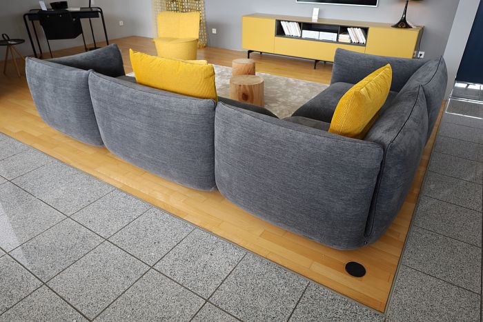 Polstergruppe (LxT): 319 x 256 cm, Stoff 8300 lichtgrau, Schmalfuß F04 stahl Feinstruktur, Rückenkissenfüllung Luftzellenstäbchen, Sitzkissenfüllung Visko, inkl. 2 Kuschelkissen Bezug 8212 dunkelgrau, statt 15.069,-