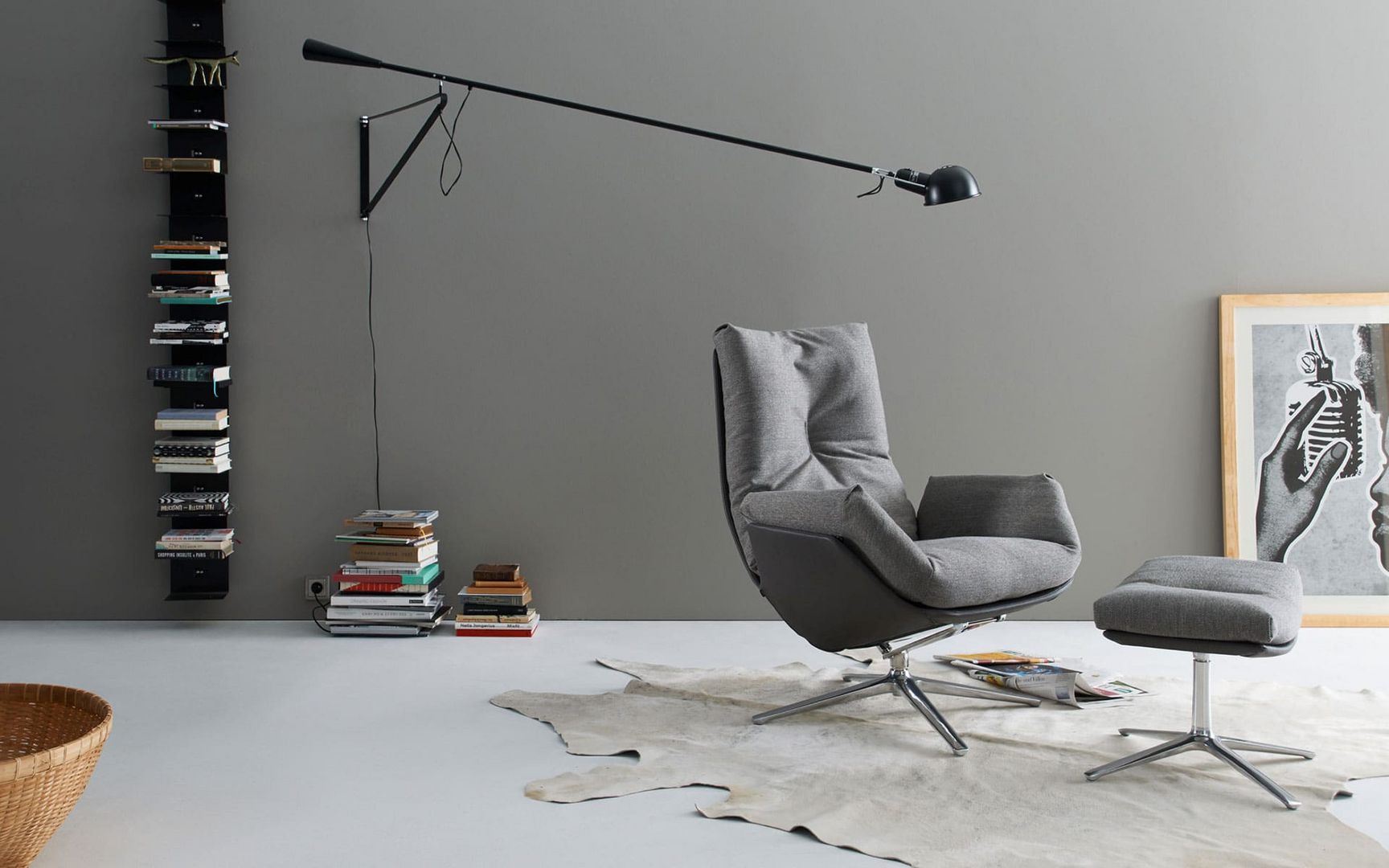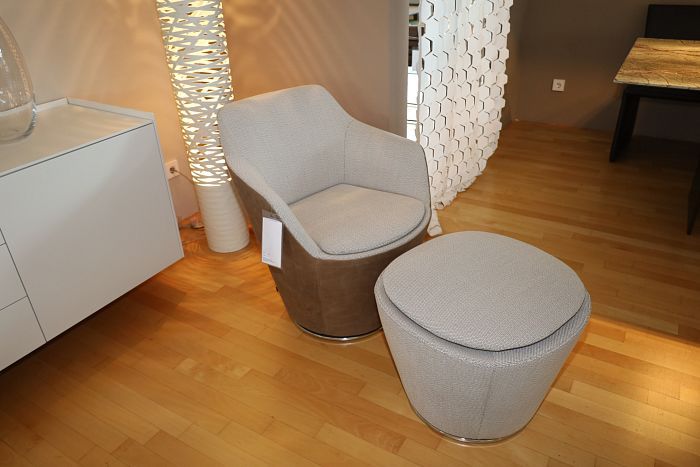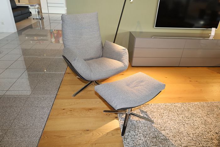 Sessel mit Hocker, Korpus Leder 282 basalt, Sitz und Rücken Stoff 8074 platin, mit Kippmechanik, Gestell 4- Fußgestell Alu poliert mit Kunststoffgleiter, statt 7.542,-