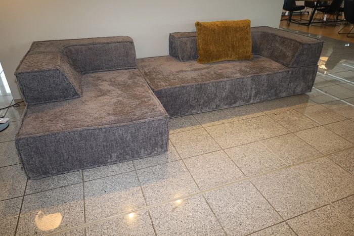 Polstergruppe (BxT): 287 x 225/85 cm , Stoff 8079 aschgrau, Schmalfüsse Edelstahl, Luftzellenstäbchenfüllung, inkl. 1 Kopfstütze mit Klappfunktion und 2 Kuschelkissen in Stoff 5026 nougat ecru, statt 14.160,-
