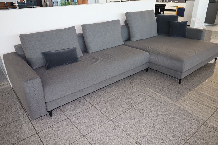 Polstergruppe (BxT): 380 x 173 cm, Sitzhöhe: 41 cm, Sitz Lounge Plus, Stoff 24.255 schiefergrau, Fuß Alu schwarz, inkl. 3 Rückenkissen und 3 Kuschelkissen, statt 12.804,-