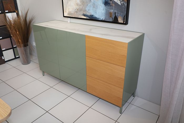 Sideboard (BxHxT) 150 x 87 x 43 cm, Korpus Lack hochglanz salbei, Fronten Lack hochglanz salbei / Furnier Eiche, Einlegeplatte Keramik Calacatta, Gußfuß Lack matt salbei, statt 6.988,-