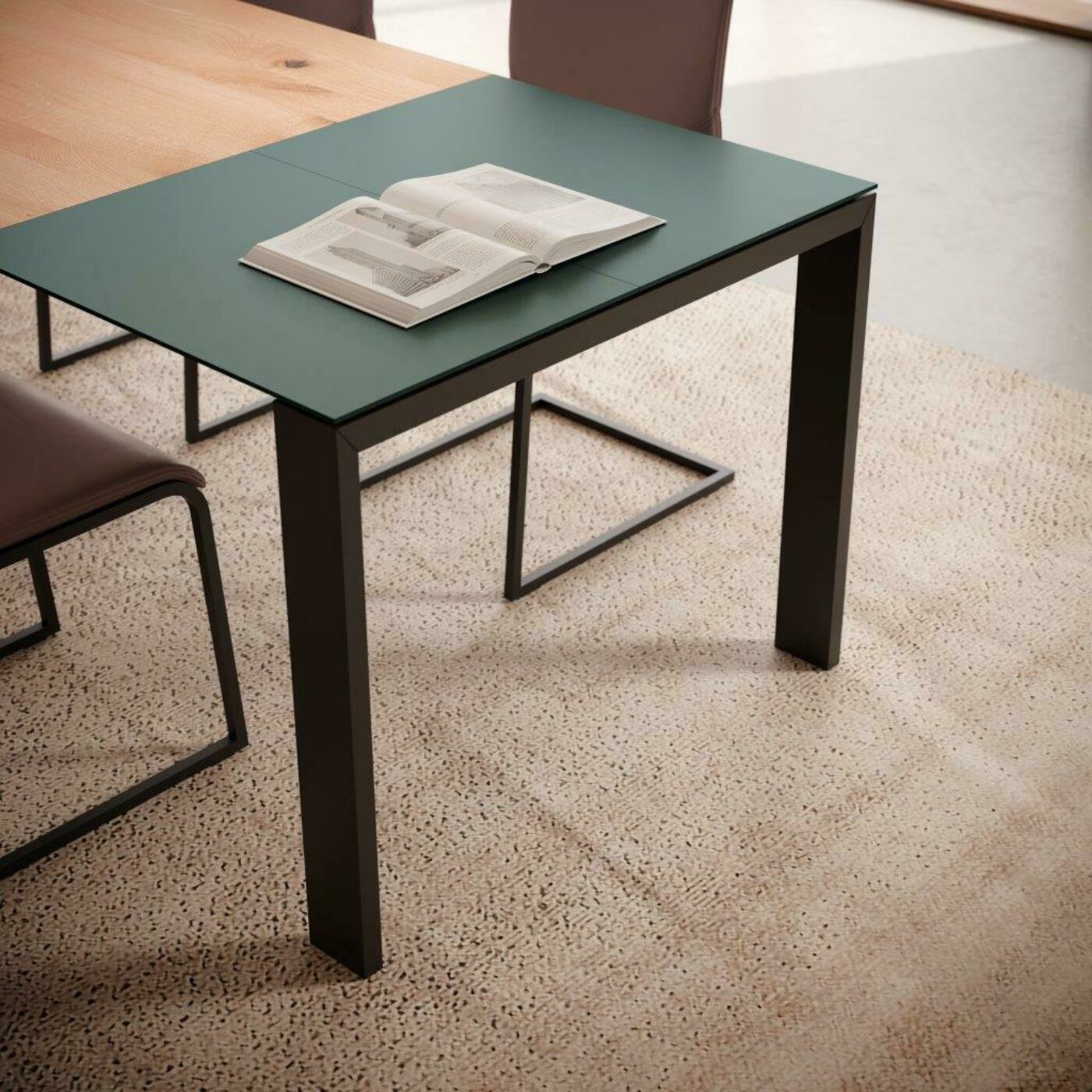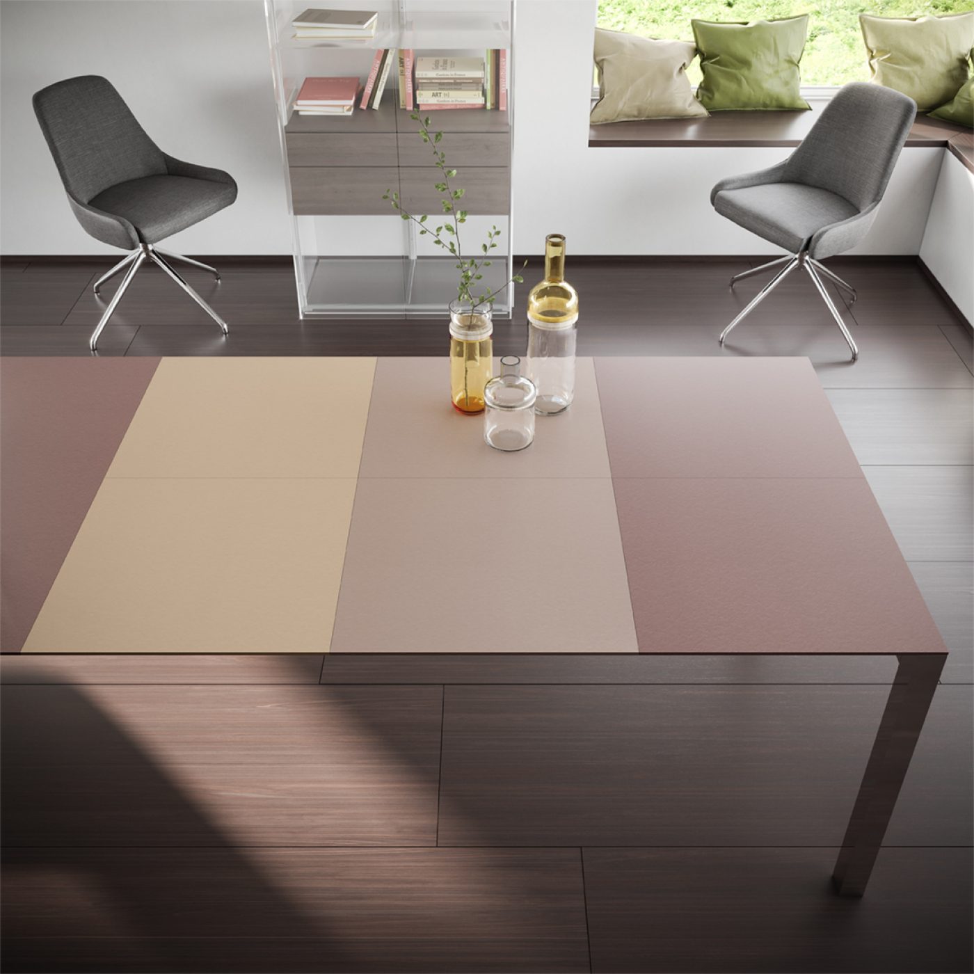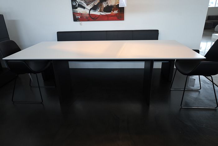 Die Form und Materialien der Tischplatte sind wählbar in Massivholz, Keramik, HPL, lackiert oder in Glas matt und glänzend.