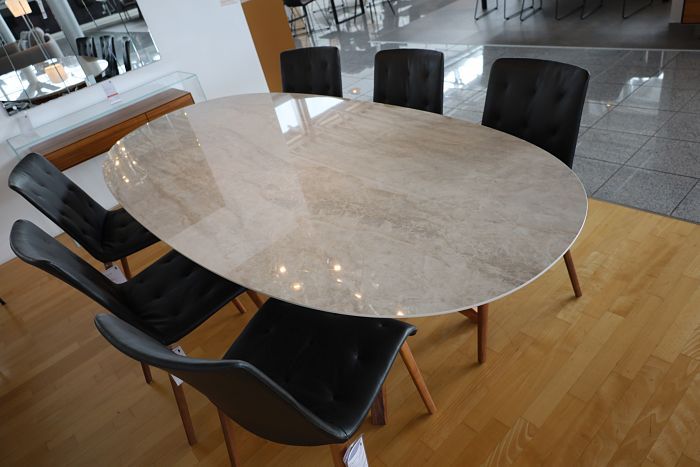 - Die Form und Materialien der Tischplatte sind wählbar in Massivholz, Keramik, HPL, lackiert oder in Glas matt und glänzend.